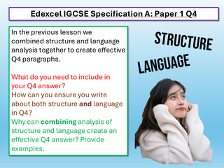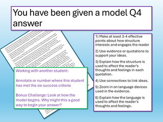 We look at non-fiction texts and AO2, selecting key information and making interpretations, exploring the use of structure language in the extract. We analyse a Q4 model answer, including the use of an effective introduction, before going on to write scaffolded structure and language Q4 answers. We use peer assessment and success criteria to evaluate the effectiveness of our analyses.