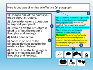 Edexcel IGCSE English Language Paper 1 Section A Q4 lesson, exploring an extract from Chinese Cinderella, by Adeline Yen Mah (from the anthology for component 1). We look at non-fiction texts and AO2, selecting key information and making interpretations, exploring the use of structure language in the extract. We analyse a Q4 model answer, including the use of an effective introduction, before going on to write scaffolded structure and language Q4 answers. We use peer assessment and success criteria to evaluate the effectiveness of our analyses. The resource includes a full model answer for Q4. Designed for Edexcel IGCSE Specification A (4EA1), differentiated throughout. It is full of adaptive learning strategies that are useful for a range of abilities.
