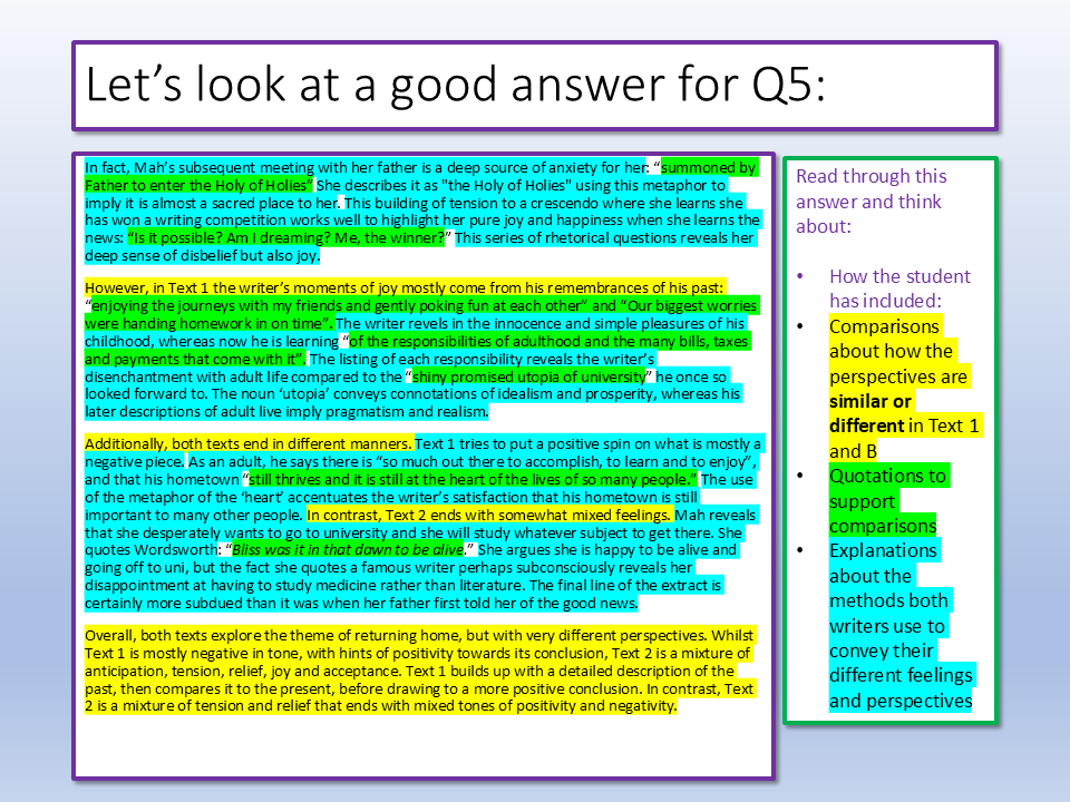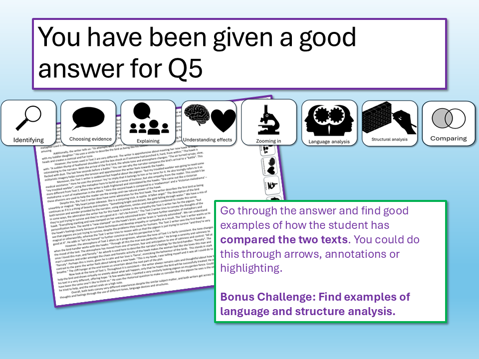 We explore a model Q5 answer and how it draws comparisons between Text 1 and Text 2, before using success criteria and modelled examples to create effective draft answers for the comparing task of Paper 1/Component 1.