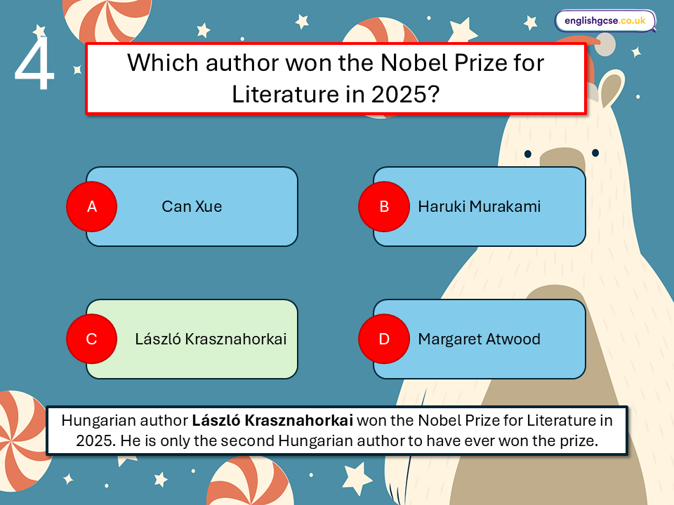 FREE English Christmas Quiz with 15 questions and answers that cover news stories around literature and books from across the year 2025.