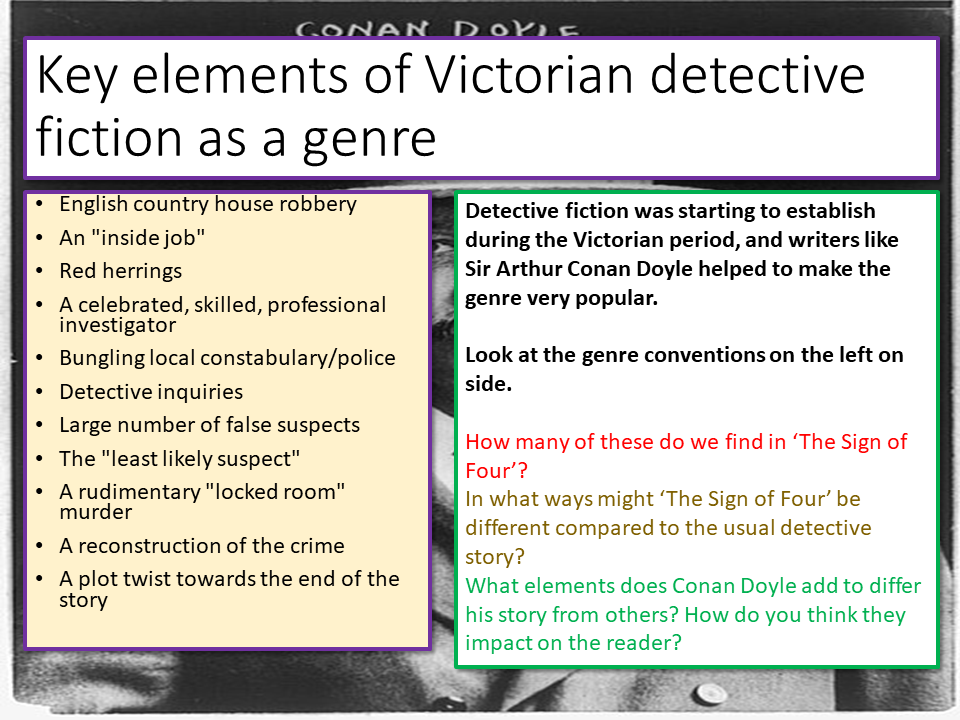 Sign of Four - A fully differentiated lesson that focuses on Chapter Nine and helps students to consider Victorian detective fiction genre conventions, how Conan Doyle uses them to his advantage and how Sherlock Holmes is presented in the chapter. A brilliant lesson for those students analysing The Sign of Four by Sir Arthur Conan Doyle for AQA English Literature Paper 1 or for KS3 students, too.
