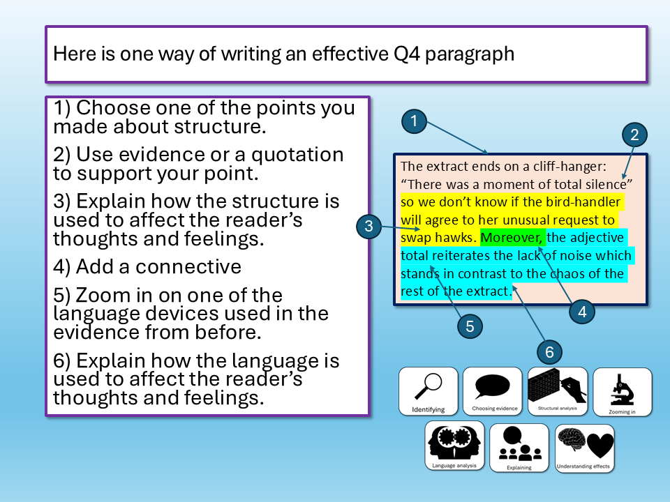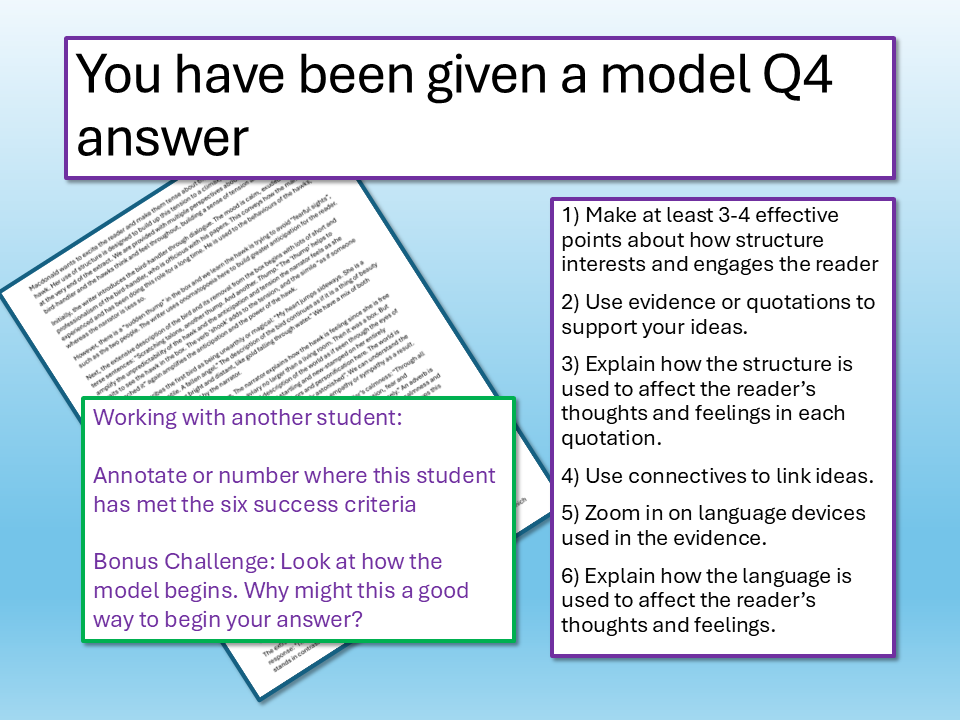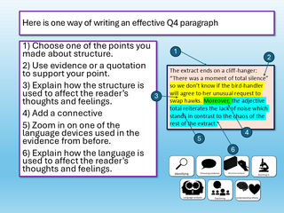 We look at non-fiction texts and AO2, selecting key information and making interpretations, exploring the use of structure language in the extract. We analyse a Q4 model answer, including the use of an effective introduction, before going on to write scaffolded structure and language Q4 answers. We use peer assessment and success criteria to evaluate the effectiveness of our analyses.