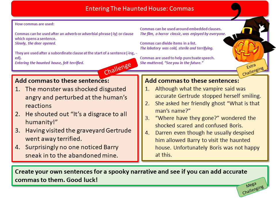 Halloween English punctuation workshop that supports students to develop their use of punctuation and grammar by providing them with differentiated worksheets on capital letters, full stops, commas, paragraphing, apostrophes, semi-colons and dashes. By the end of the lesson students are given reward badges depending on which challenges that have completed within the lesson. A really useful lesson for KS3 students and some very nifty strategies for KS4 students to use as well.