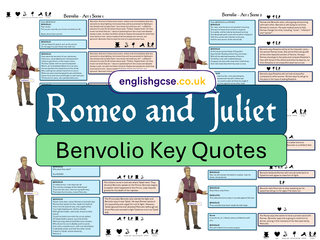 Romeo and Juliet William Shakespeare Benvolio quotes analysed - 24 quotations with explanations and theme links. Perfect for revision, displays, homework, intervention and more for GCSE English Literature exams and assessments.