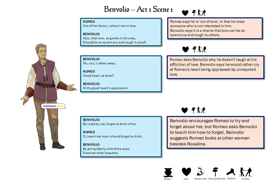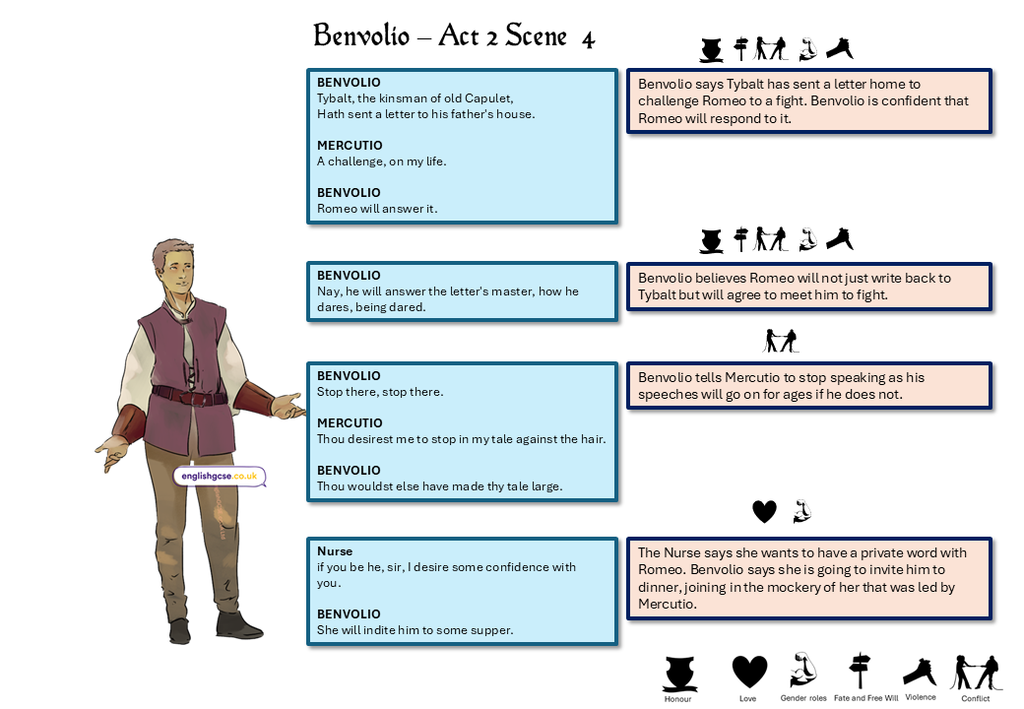 10 posters featuring a wide range of quotes from Benvolio that link together themes through dual coding, as well as detailed explanations of themes, context and language analysis.