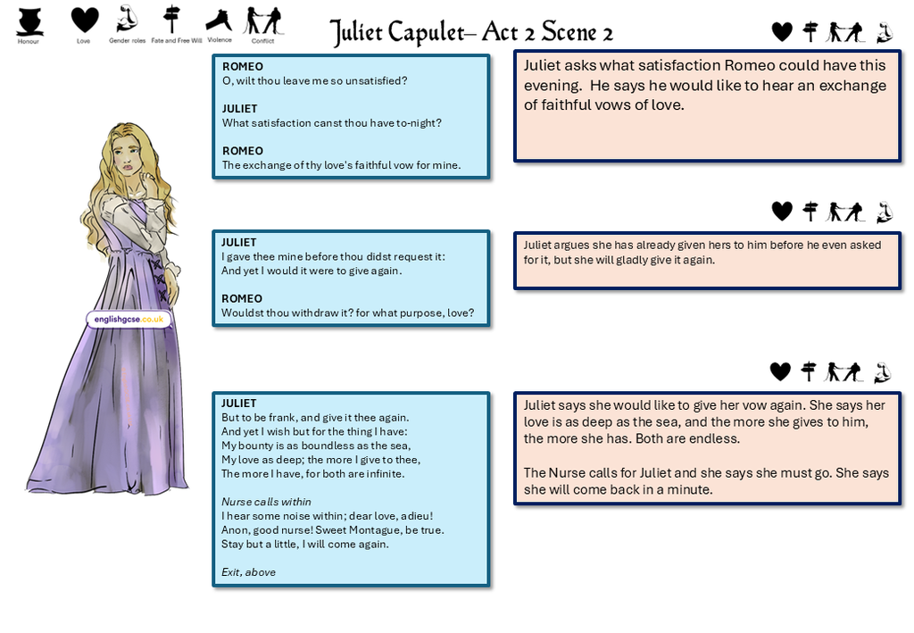 32 posters featuring a wide range of quotes from Juliet that link together themes through dual coding, as well as detailed explanations of themes, context and language analysis.