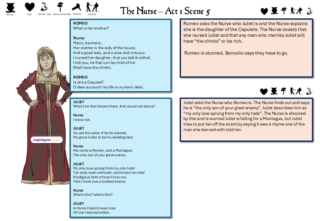 Romeo and Juliet William Shakespeare The Nurse quotes analysed - 44 quotations with explanations and theme links. Perfect for revision, displays, homework, intervention and more for GCSE English Literature exams and assessments.