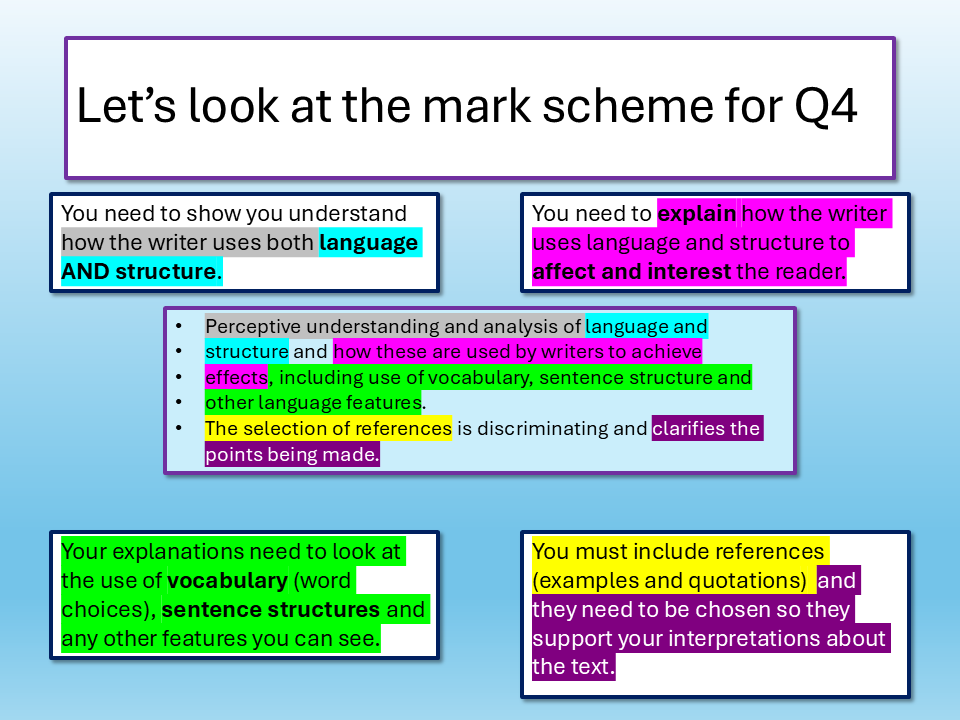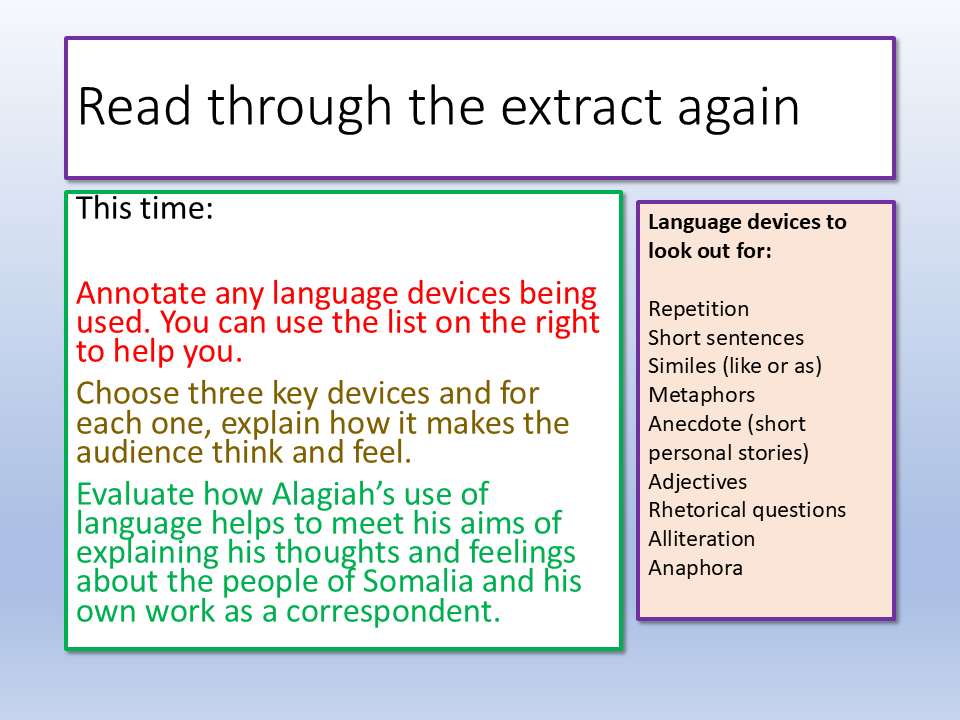 We look at the purpose and audience of the text, selecting key information and making interpretations, exploring the use of language in the extract and the effects it has on the audience, including specific examples and how they affect the audience.