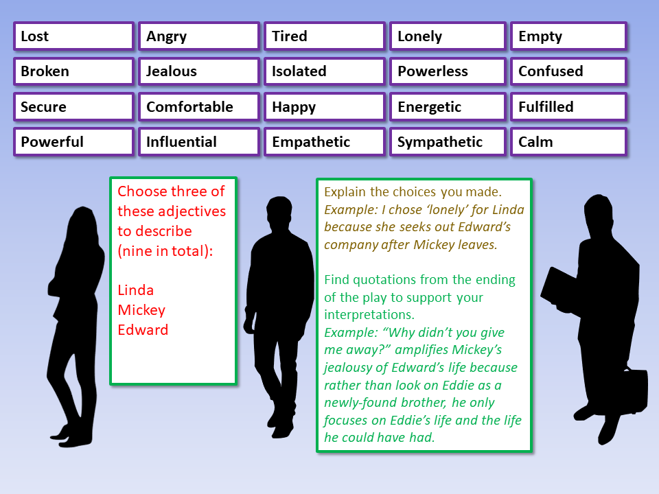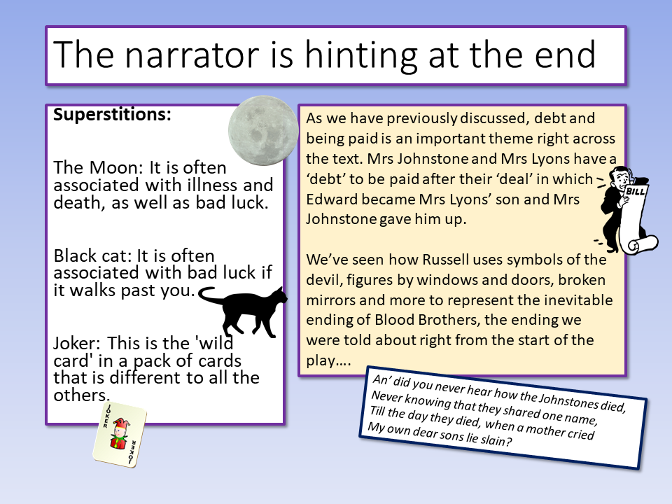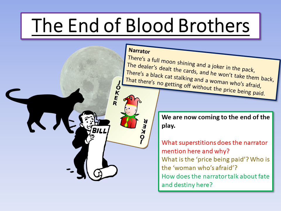 Blood Brothers lesson that explores the ending of the play, Mickey’s descent into depression, Linda and Edward’s affair and all the other key events as we finally see the conclusion of this brilliant tragedy. We look at a range of dramatic techniques Willy Russell uses in order to engage his audience and how he did so. A really useful lesson for students preparing for AQA English Literature Paper 2 and other exam boards like EDUQAS, WJEC, Edexcel, OCR and more as we study Willy Russell’s fantastic play.