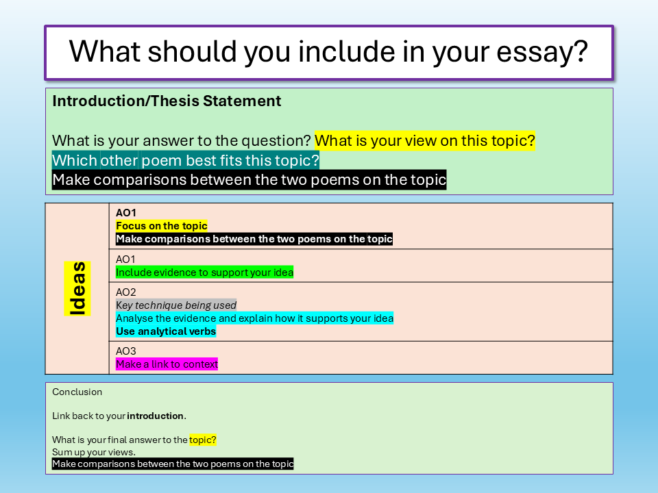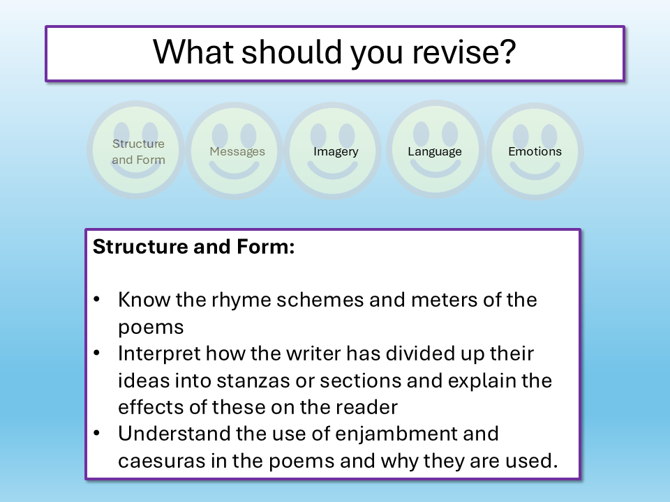 The resource includes key areas to revise for language, messages, imagery, structure and form, themes and context, as well as a look at the mark scheme in student-friendly language, and an overview of how to approach an exam essay task.