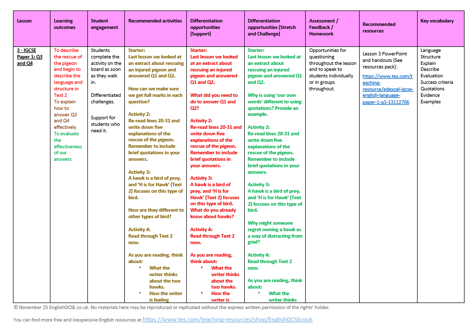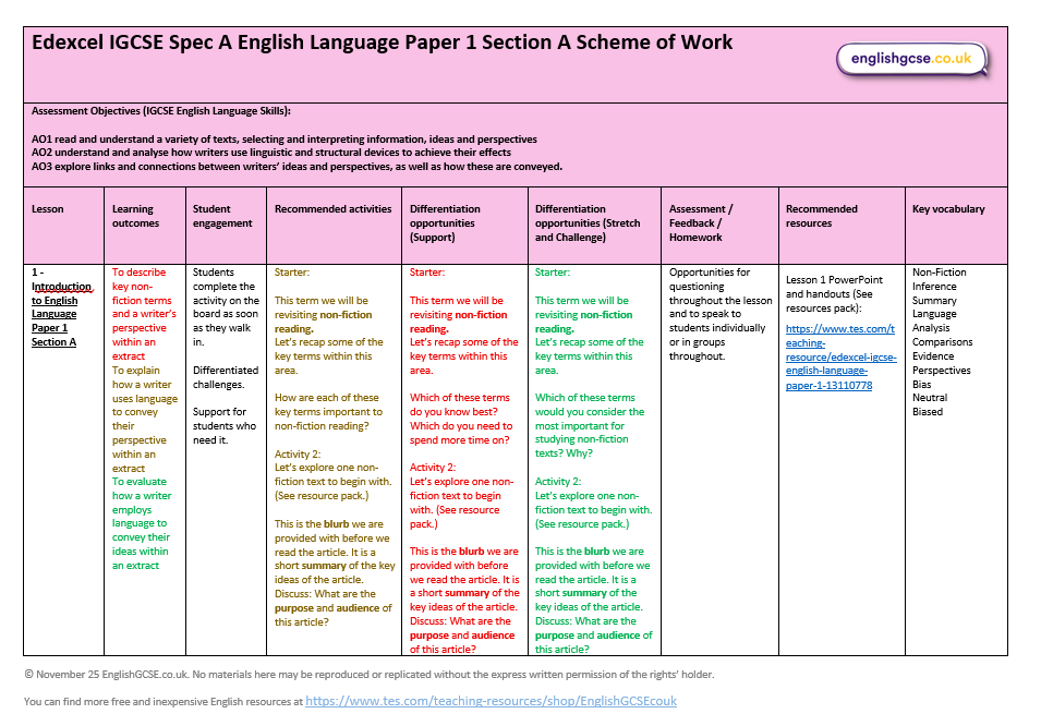 Edexcel IGCSE English Language Paper 1 Scheme of Work / Scheme of Learning